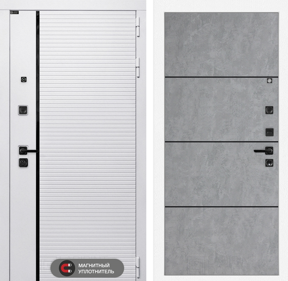Входная белая дверь Лабиринт ROYAL 25 - Бетон светлый, черный молдинг