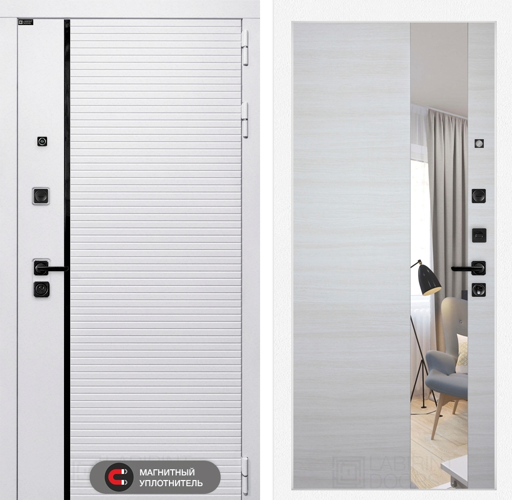 Входная белая дверь Лабиринт ROYAL с зеркалом Акация светлая поперечная