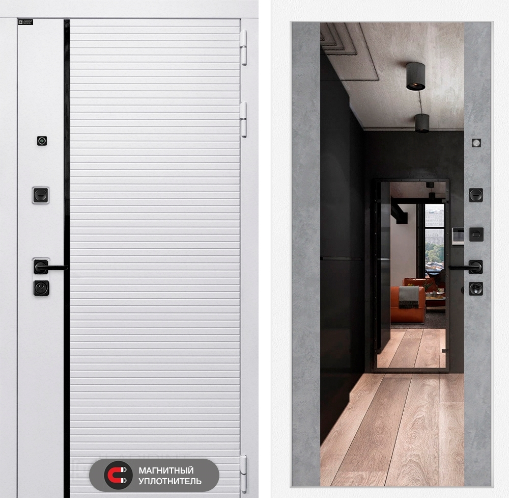 Входная белая дверь Лабиринт ROYAL с зеркалом Максимум - Бетон светлый