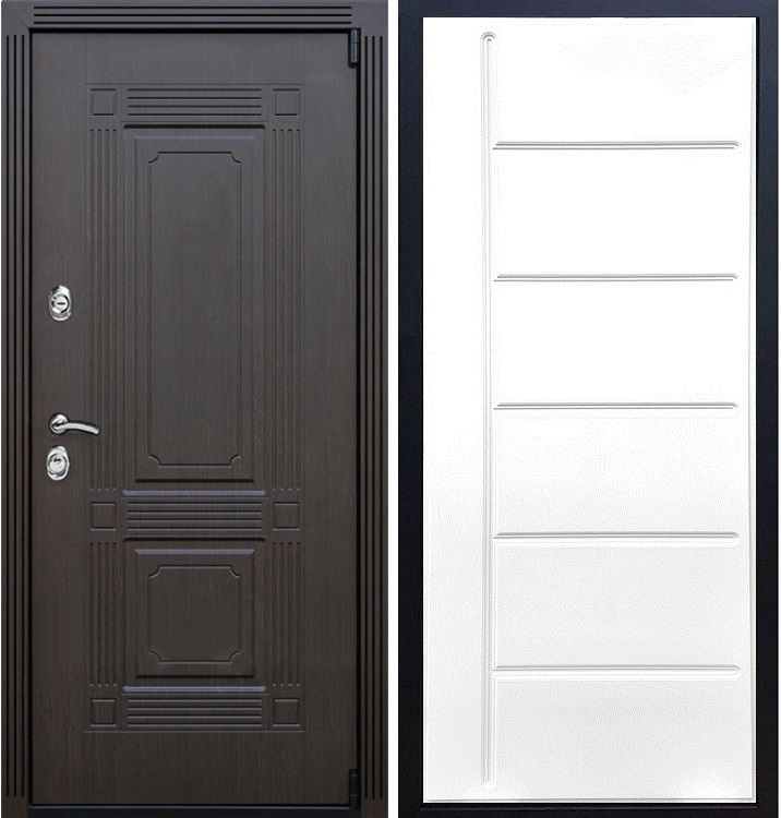 В комплект двери входит - Полотно + короб, декоративная панель с двух сторон, 2 - замка, личинка, ручки, декоративные накладки
