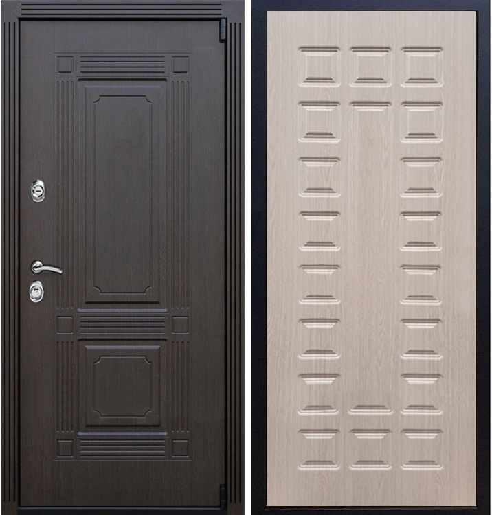 В комплект двери входит - Полотно + короб, декоративная панель с двух сторон, 2 - замка, личинка, ручки, декоративные накладки