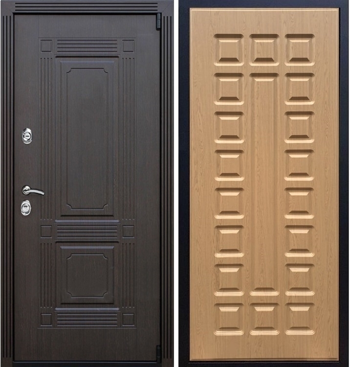 В комплект двери входит - Полотно + короб, декоративная панель с двух сторон, 2 - замка, личинка, ручки, декоративные накладки