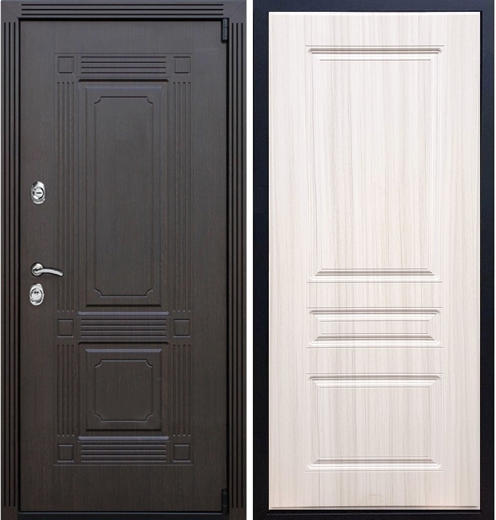 В комплект двери входит - Полотно + короб, декоративная панель с двух сторон, 2 - замка, личинка, ручки, декоративные накладки